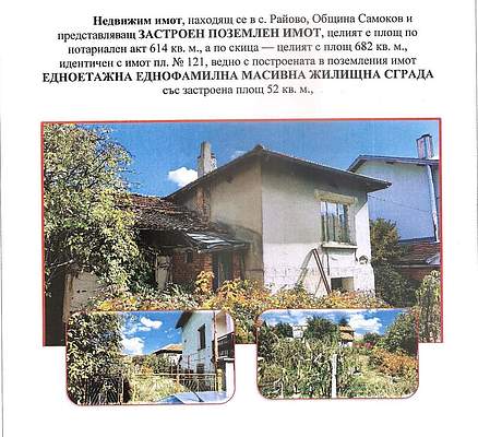 НЕДВИЖИМ ИМОТ, находящ се в с. Райово, общ. Самоков и представляващ ЗАСТРОЕН ПОЗЕМЛЕН ИМОТ, целият с площ по нотариален акт 614 кв.м., а по скица – целият с площ от 682 кв.м., при граници (съседи) по скица: улица, УПИ ХІ-122, УПИ ІV-112, УПИ VІ-117, УПИ ІХ-119, 120 и имот с планоснимачен № 120, който е идентичен с имот планоснимачен № 121 по кадастралната основа на регулационния план на с. Райово от 1982 г., за който по този план е отреден съсобствен по регулация урегулиран поземлен имот Х -120, 121 в кв. 10 при неуредени сметки по регулация, ВЕДНО с построената в поземления имот ЕДНОЕТАЖНА ЕДНОФАМИЛНА МАСИВНА ЖИЛИЩНА СГРАДА със застроена площ от 52 кв. м.