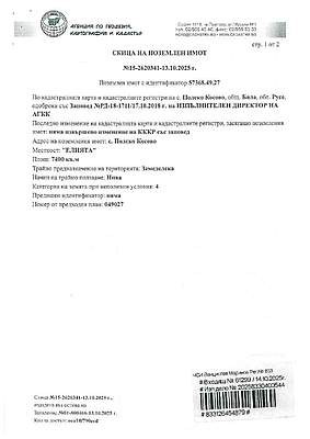 ОБЯВЛЕНИЕ ЗА ЕЛЕКТРОНЕН ПУБЛИЧЕН ТЪРГ№ 20941 / 10.11.2025Изпълнително дело №: 20258330400544 Подписаният Венцислав Маринов – частен съдебен изпълнител №833, обявявам на интересуващите се, че на онлайн платформата за електронни публични търгове към Министерството на правосъдието на адрес zapori.mjs.bg ще се проведе продажба на следното имущество, обект на принудително изпълнение по делото, собственост наРОСИЦА НЕДЕЛЧЕВА ИВАНОВА, а именно: 1/2 ид.ч. (една втора идеална част) от поземлен имот с идентификатор 57368.49.27 (петдесет и седем хиляди триста шестдесет и осем, точка, четиридесет и девет, точка, двадесет и седем), по кадастралната карта и кадастралните регистри на село Полско Косово, община Бяла, област Русе, одобрени със Заповед № РД-18-1711/17.10.2018 г. на изпълнителния директор на АГКК, с адрес: село Полско Косово, местност "Елията", с площ от 7 400 кв.м (седем хиляди и четиристотин квадратни метра), с трайно предназначение на територията: земеделска, начин на трайно ползване: нива, категория на земята при неполивни условия: четвърта, номер по предходен план: 049027 (четиридесет и девет хиляди двадесет и седем), при съседи: 57368.49.21, 57368.49.28, 57368.49.544, 57368.49.19, 57368.49.30.ПЪРВОНАЧАЛНА ЦЕНА: 7 048.00 ЛВ.вписана Възбрана в полза на взискателя ЮРОБАНК БЪЛГАРИЯ АД, Определям Всеки Понеделник и Сряда от 15.00 до 17.00 ч. за запознаване с книжата на имота. Срок за регистрация: от 18.11.2025 г. до 17,00 часа на 18.12.2025 г.Срок за наддаване: НАЧАЛО: 23.12.2025 г. 09:00 ч. КРАЙ: 29.12.2025 г.17:00 ч. Желаещите да купят могат да се явят в кантората на съдебния изпълнител в работно време, за да прегледат книжата. За участие в електронния търг, следва всеки наддавач следва да се регистрира на онлайн платформата за електронни публични търгове към Министерството на правосъдието. Всеки наддавач следва да внесе задатък в размер на 10% от обявената цена по сметка в ЦКБ АД Русе: BG11 CECB 9790 1072 1049 01, BIC: CECBBGSF. На основание Наредба № Н-3/06.04.2023 г. на МП, Към момента на регистрацията участникът прилага:Декларация по Закона за мерките срещу изпирането на пари;Декларация за липса на обстоятелства по чл. 490 от Гражданския процесуален кодекс и чл. 185 от Закона за задълженията и договорите;Квитанция за внесен задатък;Пълномощно, ако заявката се подава чрез пълномощник.Срокът за регистрация приключва на 18.12.2025 г., След изтичане на срока за регистрация следва наддаване в посочения по-горе срок. Платформата изпраща по реда на чл. 26 автоматични съобщения до всички наддавачи за започване на наддаването двадесет и четири часа, както и един час преди неговото начало.Наддаването се извършва от всеки наддавач само в платформата чрез команда за наддаване.При постъпване на наддавателно предложение платформата отразява това в публичната информация, като автоматично изчислява и показва следващата цена, по-висока с една стъпка. Два часа преди изтичане на срока за наддаване платформата изпраща автоматично съобщение за това до всички наддавачи на електронен адрес. Наддаването приключва в посоченото време, ако няма подадено наддавателно предложение през последните 10 минути на търга. При подаване на ново предложение в последните 10 минути на търга той се удължава автоматично с още 10 минути, считано от изтичането на срока за наддаване. Купувачът в двуседмичен срок от обявяването му е длъжен да внесе предложената от него цена, като приспадане внесения задатък.