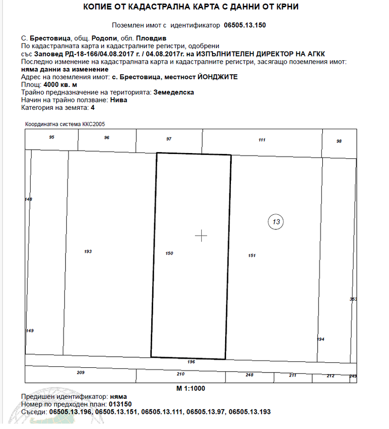 ИД № 20238250400883 -1/6 ид. ч. (една шеста идеална част) от поземленимот с идентификатор 06505.13.150 (нула, шест, пет, нула, пет, точка, едно, три, точка, едно, пет, нула), по кадастралната карта и кадастралните регистри на с. Брестовица, общ. Родопи, обл. Пловдив, одобрени със Заповед РД-18-166/04.08.2017 г. на ИЗПЪЛНИТЕЛЕН ДИРЕКТОР НА АГКК, с адрес на поземления имот: с. Брестовица, местност ЙОНДЖИТЕ, с площ: 4000 кв. м. (четири хиляди квадратни метра), с трайно предназначение на територията: Земеделска и начин на трайно ползване: Нива, с категория на земята: 4 (четвърта), с номер по предходен план: 013150 и съседи: 06505.13.196, 06505.13.151, 06505.13.111, 06505.13.97, 06505.13.193. Началната цена, от която ще започне публичната продан на гореописания имот е в размер на 1152,00€ (хиляда сто петдесет и две евро), съставляваща 90 % от началната цена по първата публична продан, съгласно чл. 494, във връзка с чл. 485 от ГПК.