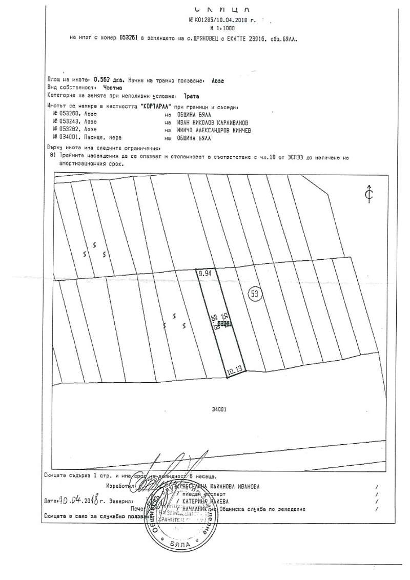 ОБЯВЛЕНИЕ ЗА ЕЛЕКТРОНЕН ПУБЛИЧЕН ТЪРГ№ 8008 / 15.04.2026Изпълнително дело №: 20188330400179 Подписаният Венцислав Маринов – частен съдебен изпълнител №833, обявявам на интересуващите се, че на онлайн платформата за електронни публични търгове към Министерството на правосъдието на адрес zapori.mjs.bg ще се проведе продажба на следното имущество, обект на принудително изпълнение по делото, собственост наЕМИЛ АНГЕЛОВ ИЛИЕВ, а именно: ПОЗЕМЛЕН ИМОТ № 053261/нула пет три две шест едно/, находящ се в землището на с. Дряновец, община Бяла, област Русе, местност КОРТАРЛА, с площ 0.562 дка /нула цяло петстотин шестдесет и два декара/; Начин на трайно ползване: ЛОЗЕ; вид собственост: частна; категория на земята при неполивни условия: трета. Граници и съседи: имот № 053260 – лозе; имот № 053243 – лозе; имот № 053262 – лозе; имот № 034001 – пасище, мера. Върху имота има следните ограничения: Трайните насаждения да се опадват и стопанисват в съответствие с чл. 18 от ЗСПЗЗ до изтичане на амортизационния срок, а съгласно кадастрална карта - ПОЗЕМЛЕН ИМОТ с идентификатор 23916.53.261 /две три девет едно шест точка пет три точка две шест едно/, находящ се в с. Дряновец, общ. Бяла, обл. Русе, местност КОРТАРЛА, с площ 562 кв.м. /петстотин шестдесет и два квадратни метра/; Трайно предназначение на територията: Земеделска; Начин на трайно ползване: ЛОЗЕ; категория на земята: 3 /трета/; предходен идентификатор: няма; номер по предходен план: 053261. Съседи на поземления имот: 23916.53.260, 23916.53.262, 23916.53.244, 23916.53.243, 23916.34.1. ЦЕНА: 230.00 €вписана Възбрана в полза на РАЙОНЕН СЪД - ГР. РАЗГРАДОпределям всеки Понеделник и Сряда от 15.00 до 17.00 ч. за запознаване с книжата на имота.Срок за регистрация: от 04.05.2026 г. до 17,00 часа на 04.06.2026 г.Срок за наддаване: НАЧАЛО: 09.06.2026 г. 09:00 ч.КРАЙ: 15.06.2026 г. 17:00 ч.Желаещите да купят могат да се явят в кантората на съдебния изпълнител в работно време, за да прегледат книжата. За участие в електронния търг, следва всеки наддавач следва да се регистрира на онлайн платформата за електронни публични търгове към Министерството на правосъдието. Всеки наддавач следва да внесе задатък в размер на 10% от обявената цена по сметка в ЦКБ АД Русе: BG11 CECB 9790 1072 1049 01, BIC: CECBBGSF. На основание Наредба № Н-3/06.04.2023 г. на МП, Към момента на регистрацията участникът прилага:Декларация по Закона за мерките срещу изпирането на пари;Декларация за липса на обстоятелства по чл. 490 от Гражданския процесуален кодекс и чл. 185 от Закона за задълженията и договорите;Квитанция за внесен задатък;Пълномощно, ако заявката се подава чрез пълномощник.Срокът за регистрация приключва на 04.06.2026 г., След изтичане на срока за регистрация следва наддаване в посочения по-горе срок. Платформата изпраща по реда на чл. 26 автоматични съобщения до всички наддавачи за започване на наддаването двадесет и четири часа, както и един час преди неговото начало.Наддаването се извършва от всеки наддавач само в платформата чрез команда за наддаване.При постъпване на наддавателно предложение платформата отразява това в публичната информация, като автоматично изчислява и показва следващата цена, по-висока с една стъпка. Два часа преди изтичане на срока за наддаване платформата изпраща автоматично съобщение за това до всички наддавачи на електронен адрес. Наддаването приключва в посоченото време, ако няма подадено наддавателно предложение през последните 10 минути на търга. П