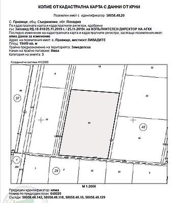 ИД 20228250400873Поземлен имот с идентификатор58058.48.20 (пет, осем, нула, пет, осем, точка, четири, осем, точка, две, нула) по кадастралната карта и кадастралните регистри на с. Правище, община Съединение, област Пловдив, одобрени със Заповед за одобрение на КККР № РД-18-818/25.11.2019 г. на ИЗПЪЛНИТЕЛЕН ДИРЕКТОР НА АГКК, с адрес: с. Правище, община Съединение, м. ЛИВАДИТЕ,вид територия Земеделска, категория 3 (трета), начин на трайно ползване: Нива, площ15449 кв.м (петнадесет хиляди четиристотин четиридесет и девет квадратни метра), стар номер 048020, съседи: 58058.48.142; 58058.48.118; 58058.48.19; 58058.48.129, с описание съгласно акт за собственост:НИВА с площ 15.450 дка /петнадесет декара четиристотин и петдесет квадратни метра/, от които 4.166 дка (четири декара сто шестдесет и шест квадратни метра) - четвърта и 11.284 (единадесет декара двеста осемдесет и четири квадратни литра) - трета категория на земята, находяща се в местността "ЛИВАДИТЕ", в землището на с. Правище с EKAТТЕ 58058 (пет осем нула пет осем), общ. Съединение, обл. Пловдив, съставляваща имот № 048020 (нула, четири, осем, нула, две, нула), при граници и съседи по скица: имот № 000142 - напоителен канал на Община Съединение - Канали, имот № 048129 - Полски път на Община Съединение, имот № 048019 - Нива на Митра Петкова Кунтова и имот № 048118 – напоителен канал на Община Съединение – Канали. Началната цена, от която ще започне публичната продан е в размер на 17 081,24 € (седемнадесет хиляди осемдесет и едно евро и двадесет и четири евроцента), съставляваща 80 % от стойността на имота, съгласно чл. 485 от ГПК.