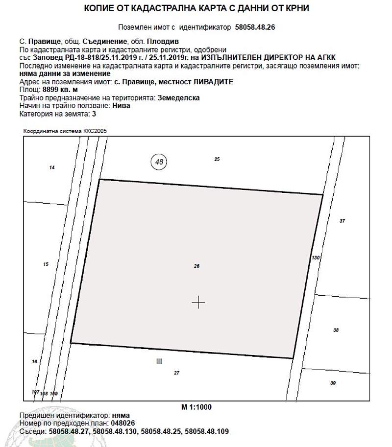 ИД 20228250400873Поземлен имот с идентификатор58058.48.26(пет, осем, нула, пет, осем, точка, четири, осем, точка, две, шест) по кадастралната карта и кадастралните регистри на с. Правище, община Съединение, област Пловдив, одобрени със Заповед за одобрение на КККР № РД-18-818/25.11.2019 г. на ИЗПЪЛНИТЕЛЕН ДИРЕКТОР НА АГКК, с адрес: с. Правище, община Съединение, м. ЛИВАДИТЕ,вид територия Земеделска, категория 3 (трета), начин на трайно ползване: Нива, площ 8899 кв.м (осем хиляди осемстотин деветдесет и девет квадратни метра), стар номер 048026, съседи: 58058.48.27, 58058.48.130, 58058.48.25, 58058.48.109, с описание съгласно акт за собственост:НИВА с площ от 8,899 дка (осем декара осемстотин деветдесет и девет квадратни метра, трета категория на земята, находяща се в местността "ЛИВАДИТЕ", в землището на с. Правище с ЕКАТТЕ 58058 (пет, осем, нула, пет, осем), общ. Съединение, обл. Пловдив, съставляваща имот № 048026 (нула, четири, осем, нула, две, шест), при граници и съседи по скица: имот № 048025 - Нива на Славчо Костадинов Мърваков, имот № 048109 -Полски път па Община Съединение, имот № 048027 - Нива на насл. на Бончо Танев Шилев и имот № 048130 - напоителен канал на Община Съединение – канали. Началната цена, от която ще започне публичната продан е в размер на 9 837,26 € (девет хиляди осемстотин тридесет и седем евро и двадесет и шест евроцента), съставляваща 80 % от стойността на имота, съгласно чл. 485 от ГПК.