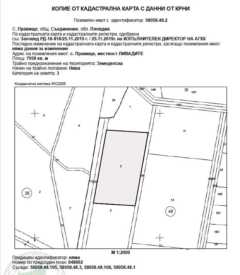 ИД 20228250400873Поземлен имот с идентификатор 58058.48.2 (пет, осем, нула, пет, осем, точка, четири, осем, точка, две) по кадастралната карта и кадастралните регистри на с. Правище, община Съединение, област Пловдив, одобрени със Заповед за одобрение на КККР № РД-18-818/25.11.2019 г. на ИЗПЪЛНИТЕЛЕН ДИРЕКТОР НА АГКК, с адрес: с. Правище, община Съединение, м. ЛИВАДИТЕ,вид територия Земеделска, категория 3 (трета), начин на трайно ползване: Нива, площ7958 кв.м (седем хиляди деветстотин петдесет и осем квадратни метра), стар номер 048002, съседи: 58058.48.105, 58058.48.3, 58058.48.106, 58058.48.1, с описание съгласно акт за собственост:ПОЗЕМЛЕН ИМОТ № 048002 /нула, четири, осем, нула, нупа, две/, находящ се в землището на село Правище, община Съединение, област Пловдив, ЕКАТТЕ 58058 /петдесет и осем хилядни петдесет и осем/, с площ на имота 7,958 дка / седем декара и деветстотин петдесет и осем квадрати метра/, начин на трайно ползване - нива, категория на земята при неполивни условия - четвърта (2,785 дка - два декара седемстотин осемдесет и пет кв.м); трета (5,173 дка - пет декара сто седемдесет и три кв.м.), който имот се намира в местността "Ливадите", при граници и съседи: имот № 048105 - полски път на Община Съединение; имот № 048001 - нива на Община Съединение, имот № 048106 - напоителен канал на Община Съединение - Канали, имот № 048003 - нива на Петър Богданов Шилев. Началната цена, от която ще започне публичната продан е в размер на 9 317,78 € (девет хиляди триста и седемнадесет евро и седемдесет и осем евроцента), съставляваща 80 % от стойността на имота, съгласно чл. 485 от ГПК.