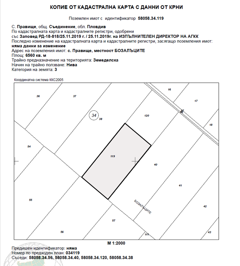 ИД 20228250400873Поземлен имот с идентификатор58058.34.119 (пет, осем, нула, пет, осем, точка, три, четири, точка, едно, едно, девет) по кадастралната карта и кадастралните регистри на с. Правище, община Съединение, област Пловдив, одобрени със Заповед за одобрение на КККР № РД-18-818/25.11.2019 г. на ИЗПЪЛНИТЕЛЕН ДИРЕКТОР НА АГКК, с адрес: с. Правище, община Съединение, м. БОЗАЛЪЦИТЕ, вид територия Земеделска, категория 3 (трета), Начин на трайно ползване: Нива, с площ: 6560 кв.м (шест хиляди петстотин и шестдесет квадратни метра), стар номер 034119, съседи: 58058.34.56; 58058.34.40; 58058.34.120; 58058.34.38, с описание по акт за собственост: НИВА с площ от 6.560 дка (шест декара петстотин и шестдесет квадратни метра), трета категория на земята, находя ща се в местността "БОЗАЛЪЦИТЕ", в землището на с. Правище с EKAТТЕ 58058 (пет осем нула пет осем), общ. Съединение, обл. Пловдив, съставляваща имот № 034119 (нула, три, четири, едно, едно девет), при граници и съседи по скица: имот № 034120 – нива на Атанас Запрянов Кунтов, имот № 034038 - Нива на Недка Кирилова Меретева, имот № 034056 - Нива на насл. на Тана Петрова Горненска и имот № 034040 - нива на насл. на Панчо Панов Пенелов, ведно с всички настоящи и бъдещи подобрения и приращения в имота.Началната цена, от която ще започне публичната продан е в размер на 6 826,77 € (шест хиляди осемстотин двадесет и шест евро и седемдесет и седем евроцента), съставляваща 80 % от стойността на имота, съгласно чл. 485 от ГПК.