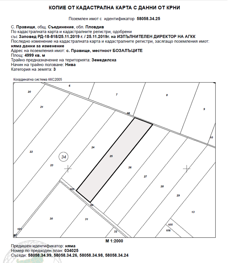 ИД 20228250400873Поземлен имотс идентификатор58058.34.25 (пет, осем, нула, пет, осем, точка, три, четири, точка, две, пет) по кадастралната карта и кадастралните регистри на с. Правище, община Съединение, област Пловдив, одобрени със Заповед за одобрение на КККР № РД-18-818/25.11.2019 г. на ИЗПЪЛНИТЕЛЕН ДИРЕКТОР НА АГКК, с адрес: с. Правище, община Съединение, м. БОЗАЛЪЦИТЕ, вид територия Земеделска, категория 3 (трета), Начин на трайно ползване: Нива,с площ: 4999 кв.м(четири хиляди деветстотин деветдесет и девет квадратни метра), стар номер 034025, съседи: 58058.34.99, 58058.34.26, 58058.34.98, 58058.34.24, с описание по акт за собственост: ПОЗЕМЛЕН ИМОТ № 034025 / нула, три, четири, нула, две, пет/, находящ се в местността "Бозалъците" в землището на село Правище, община Съединение, област Пловдив, ЕКАТТЕ 58058 /петдесет и осем хиляди и петдесет и осем/, с площ на имота от 4,999 дка /четири декара и деветстотин деветдесет и девет квадратни метра/, начин на трайно ползване - нива, категория на земята при неполивни условия --трета, при граници и съседи: имот № 034099 - полски път на Община Съединение, имот № 034024 - нива на Михо Запрянов Кунтов, имот № 034098 - напоителен канал на Община Съединение - Канали и имот № 034026 нива на Илия Кръстев Илиев, ведно с всички настоящи и бъдещи подобрения и приращения в имота. Началната цена, от която ще започне публичната продан е в размер на 5 526,04 € (петхиляди петстотин двадесет и шест евро и четири евроцента), съставляваща 80 % от стойността на имота, съгласно чл. 485 от ГПК.
