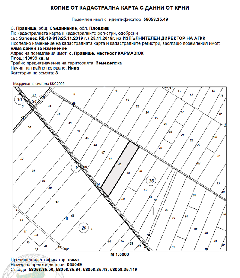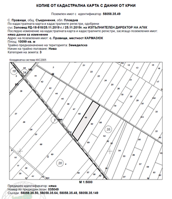 ИД 20228250400873Поземлен имот с идентификатор 58058.35.49(пет, осем, нула, пет, осем, точка, три, пет, точка, четири, девет) по кадастралната карта и кадастралните регистри на с. Правище, община Съединение, област Пловдив, одобрени със Заповед за одобрение на КККР № РД-18-818/25.11.2019 г. на ИЗПЪЛНИТЕЛЕН ДИРЕКТОР НА АГКК, с адрес: с. Правище, община Съединение, м. КАРМАЗЮК, вид територия Земеделска, категория 3 (трета), Начин на трайно ползване: Нива,с площ:10099 кв.м (десет хиляди и деветдесет и девет квадратни метра), стар номер 035049, съседи: 58058.35.50, 58058.35.64, 58058.35.48, 58058.35.149, с описание по акт за собственост:НИВА с площ от 10.100 дка /десет декара и сто кв. м./, трета категория, находяща се в местността КАРМАЗЮК, съставляваща имот № 035049 /тридесет и пет хиляди и четиридесет и девети/ в землището на с. Правище, ЕКАТТЕ 58058, община Съединение, обл. Пловдив, при граници и съседи: имот № 035048 нива на насл. на Игнат Атанасов Налбански, имот № 035064 напоителен канал на Община Съединение - канали, имот № 035050 нива на Атанас Ангелов Пелтеков, имот № 000149 полски път на Община Съединение, ведносвсички настоящи и бъдещи подобрения и приращения в имота. Началната цена, от която ще започне публичната продан е в размер на 11 166,61 € (единадесет хиляди сто шестдесети шест евро и шестдесет и един евроцента), съставляваща 80 % от стойността на имота, съгласно чл. 485 от ГПК.
