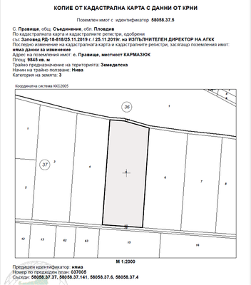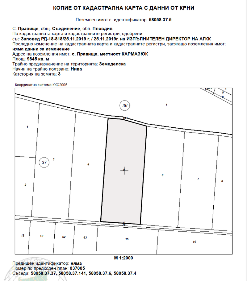 ИД 20228250400873Поземлен имотс идентификатор58058.37.5 (пет, осем, нула, пет, осем, точка, три, седем, точка, пет) по кадастралната карта и кадастралните регистри на с. Правище, община Съединение, област Пловдив, одобрени със Заповед за одобрение на КККР № РД-18-818/25.11.2019 г. на ИЗПЪЛНИТЕЛЕН ДИРЕКТОР НА АГКК, с адрес: с. Правище, община Съединение, м. КАРМАЗЮК, вид територия Земеделска, категория 3 (трета), Начин на трайно ползване: Нива,с площ:9845 кв.м (девет хиляди осемстотин четиридесет и пет квадратни метра), стар номер 037005, съседи: 58058.37.37, 58058.37.141, 58058.37.6 и 58058.37.4, с описание по акт за собственост: ПОЗЕМЛЕН ИМОТ № 037005 (нула, три, седем, нула, нула, пет), находящ се в местността "КАРМАЗЮК" в землището на село Правище, ЕКАТТЕ 58058 (петдесет и осем хиляди и петдесет и осем), общ. Съединение, обл. Пловдив, с площ от 9,846 дка (девет декара осемстотин четиридесет и шест квадратни метра), начин на трайно ползване - НИВА, категория на земята при нелоливни условия - трета, при граници и съседи: имот № 037004 - нива на насл. на Рангел Христов Паничарски, имот № 000141 - полски път на община Съединение, имот № 037006 - нива на Ангел Борисов Попов, имот № 037037 - полски път на община Съединение, ведносвсички настоящи и бъдещи подобрения и приращения в имота. Началната цена, от която ще започне публичната продан е в размер на 10 884,38 € (десет хиляди осемстотин осемдесет и четири евро и тридесет и осем евроцента), съставляваща 80 % от стойността на имота, съгласно чл. 485 от ГПК.