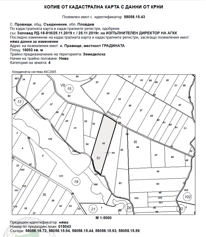 ИД 20228250400873Поземлен имот с идентификатор 58058.15.43(пет, осем, нула, пет, осем, точка, едно, пет, точка, четири, три) по кадастралната карта и кадастралните регистри на с. Правище, община Съединение, област Пловдив, одобрени със Заповед за одобрение на КККР № РД-18-818/25.11.2019 г. на ИЗПЪЛНИТЕЛЕН ДИРЕКТОР НА АГКК, с адрес: с. Правище, община Съединение, м.ГРАДИНАТА, вид територия Земеделска, категория4(четвърта), Начин на трайно ползване: Нива,с площ:16003 кв.м (щестнадесет хиляди и три квадратни метра), стар номер 015043, съседи: 58058.15.72, 58058.15.94, 58058.15.44, 58058.15.93, 58058.15.56, с описание по акт за собственост: ПОЗЕМЛЕН ИМОТ № 015043 /нула, едно, пет, нула, четири, три/, находящ се в местността "Градината" в землището на село Правище, община Съединение, област Пловдив, ЕКАТТЕ 58058 /петдесет и осем хиляди и петдесет и осем/, с площ на имота от 16,004 дка /шестнадесет декара и четири квадратни метра/, начин на трайно ползване - нива, категория на земята при неполивни условия - четвърта (10,107) - трета (5,303), при граници и съседи: имот № 015044 - овощна градина на насл. на Георги Стойчев Скачков; имот № 000071 - полски път на Обшина Съединение; имот № 015094 - нива на Богдан Петров Шилев, имот № 015093 - нива на Магдалена Петрова Ангелова и имот № 015056 - напоителен канал на Община Съединение – Канали, ведно с всички настоящи и бъдещи подобрения и приращения в имота. Началната цена, от която ще започне публичната продан е в размер на 17 694,79 € (седемнадесет хиляди шестстотин деветдесет и четириевро и седемдесет и девет евроцента), съставляваща 80 % от стойността на имота, съгласно чл. 485 от ГПК.