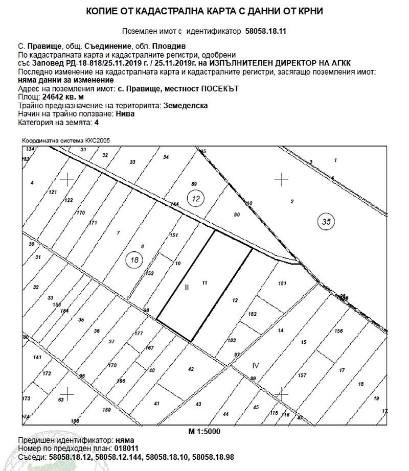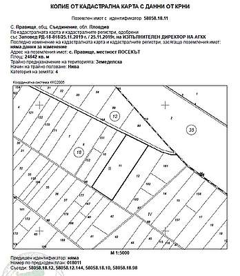 ИД № 20238250400573 - 1/6 ид.ч. (една шеста) идеална част от Поземлен имот с идентификатор 58058.18.11 (пет, осем, нула, пет, осем, точка, едно, осем, точка, едно, едно) по кадастралната карта и кадастралните регистри на с. Правище, община Съединение, област Пловдив, одобрени със Заповед за одобрение на КККР № РД-18-818/25.11.2019 г. на ИЗПЪЛНИТЕЛЕН ДИРЕКТОР НА АГКК, с адрес: с. Правище, община Съединение, м. ПОСЕКЪТ, вид територия Земеделска, категория 4 (четвърта), Начин на трайно ползване: Нива, с площ 24642.00 кв.м (двадесет и четири хиляди шестстотин четиридесет и два квадратни метра), стар номер 018011, при граници 58058.18.12; 58058.12.144; 58058.18.10; 58058.18.98, с описание по нотариален акт НИВА с площ от 24.644 дка /двадесет и четири декара и двадесет и един квадратни метра/, от които 19.021 /деветнадесет декара и двадесет и един квадратни метра/ четвърта категория и 5.623 /пет декара и шестстотин двадесет и три квадратни метра/ втора категория на земята при неполивни условия, съставляваща имот № 018011 /нула, едно, осем, нула, едно, едно/, находящ се в местността "ПОСЕКЪТ", в землището на с. Правище с ЕКАТТЕ 58058 /пет, осем, нула, пет, осем/, общ Съединение, обл. Пловдив, при граници и съседи: имот № 018098 - Полски път на Община "Съединение", имот № 018012 - Нива на насл. на Гавраил Георгиев Влашки, имот № 000036 - Напоител. Канал на Община Съединение - Канали и имот № 018010 - Нива на Пауна Игнатова Радулова.Началната цена, от която ще започне публичната продан е в размерна3579,04 € (три хиляди петстотин седемдесет и девет евро и четири евроцента), съставляваща 80 % от стойността на имота, съгласно чл. 485 от ГПК.