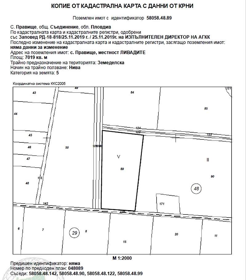 ИД № 20238250400573 - ½ (една втора) идеална част от 1829/2160 ид.ч. /хиляда осемстотин двадесет и девет върху две хиляди сто и шестдесет идеални части/ отПоземлен имот с идентификатор 58058.48.89 (пет, осем, нула, пет, осем, точка, четири, осем, точка, осем, девет) по кадастралната карта и кадастралните регистри на с. Правище, община Съединение, област Пловдив, одобрени със Заповед за одобрение на КККР № РД-18-818/25.11.2019 г. на ИЗПЪЛНИТЕЛЕН ДИРЕКТОР НА АГКК, с адрес: с. Правище, община Съединение, м. ЛИВАДИТЕ, вид територия Земеделска, категория 5 (пета), Начин на трайно ползване: Нива, с площ 7019 кв.м (седем хиляди и деветнадесет квадратни метра), стар номер 048089, при граници 58058.48.142; 58058.48.90; 58058.48.122; 58058.48.99, с описание по нотариален акт НИВА с площ от 7.020 дка /седем декара и двадесет квадратни метра/, пета категория на земята при неполивни условия, съставляваща имот № 048089 /нула, четири, осем, нула, осем, девет/, находящ се в местността "ЛИВАДИТЕ", в землището на с. Правище с ЕКАТТЕ 58058 /пет, осем, нула, пет, осем/, общ. Съединение, обл. Пловдив, при граници и съседи: имот № 048090 - Нива на Богдан Петров Шилев и др., имот № 048122 -Полски път на Община Съединение, имот № 048099 - Полски път на Община "Съединение" и имот № 000142 - Напоител. Канал на Община "Съединие" – Канали. Началната цена, от която ще започне публичната продан е в размер на 2891,87 € (две хилядиосемстотин деветдесет и едно евро и осемдесет и седем евроцента), съставляваща 80 % от стойността на имота, съгласно чл. 485 от ГПК.