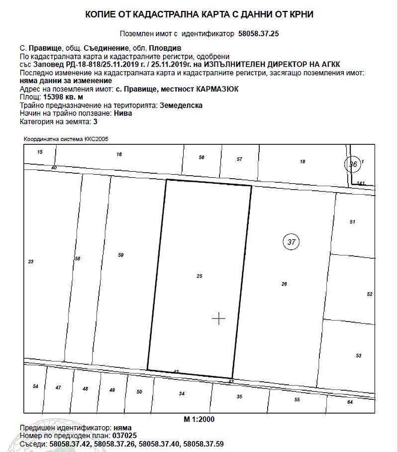 ИД № 20238250400573 -½ (една втора)идеална част от 5/9 ид.ч./пет девети идеални части/ отПоземлен имот с идентификатор 58058.37.25 (пет, осем, нула, пет, осем, точка, три, седем, точка, две, пет) по кадастралната карта и кадастралните регистри на с. Правище, община Съединение, област Пловдив, одобрени със Заповед за одобрение на КККР № РД-18-818/25.11.2019 г. на ИЗПЪЛНИТЕЛЕН ДИРЕКТОР НА АГКК, с адрес: с. Правище, община Съединение, м. КАРМАЗЮК, вид територия Земеделска, категория 3 (трета), Начин на трайно ползване: Нива, с площ 15398 кв.м (петнадесет хиляди триста деветдесет и осем квадратни метра), стар номер 037025, при граници 58058.37.42; 58058.37.26; 58058.37.40; 58058.37.59, с описание по нотариален акт НИВА с площ от 15.399 дка /петнадесет декара и триста деветдесет и девет квадратни метра/, трета категория на земята при неполивни условия, съставляваща имот № 037025 /нула, три, седем, нула, две, пет/, находящ се в местността "КАРМАЗЮК", в землището на с. Правище с ЕКАТТЕ 58058 /пет, осем, нула, пет. осем/, общ. Съединение, обл. Пловдив, при граници и съседи: имот № 037059 - Нива на Божил Пеев Влашки, имот № 037042 - Полски път на Община "Съединение", имот № 037026 - Нива на "Монтес Аури" ООД и имот № 037040 - Напоител. Канал на Община "Съединение" – Канали. Началната цена, от която ще започне публичната продан е в размер на 4 372,57 € (четири хиляди триста седемдесет и две евро и петдесет и седем евроцента), съставляваща 80 % от стойността на имота, съгласно чл. 485 от ГПК.