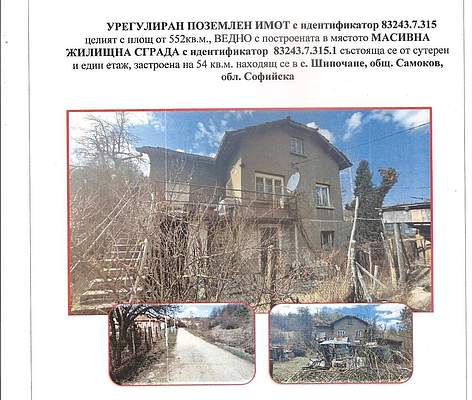 УРЕГУЛИРАН ПОЗЕМЛЕН ИМОТ с идентификатор № 83243.7.315, целият с площ от 552 кв.м., при граници: улица, Радка Софина и ниви, ВЕДНО с построената в мястото МАСИВНА ЖИЛИЩНА СГРАДА с идентификатор № 83243.7.315.1, състояща се от сутерен и един етаж, застроена на 54 кв.м., а съгласно кадастралната карта и кадастралните регистри на с. Шипочане, общ. Самоков, обл. Софийска, одобрени със Заповед № 300-5-36/01.06.2004 г. на ИД на АК представляващ ПОЗЕМЛЕН ИМОТ с идентификатор № 83243.7.315, с адрес: с. Шипочане, с площ: 552 кв.м., с трайно предназначение на територията: Урбанизирана, начин на трайно ползване: Ниско застрояване (до 10 м.), предишен идентификатор: няма, номер от предходен план: 415, квартал: 1А, при съседи: имоти с идентификатори №№ 83243.7.332, 83243.7.316, 83243.7.263, 83243.9.53, ВЕДНО с построената в имота сграда с идентификатор № 83243.7.315.1, със застроена площ от 56 кв.м, брой етажи: 1, с предназначение: ЖИЛИЩНА СГРАДА – ЕДНОФАМИЛНА.